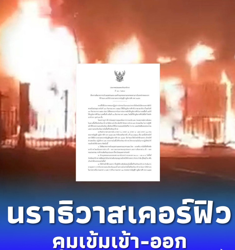 นราธิวาส ประกาศเคอร์ฟิวทุกอำเภอ ห้ามออกนอกเคหะสถาน เวลา 21.00-05.00 น. คุมเข้มความปลอดภัย หลังเหตุไม่สงบถี่ มีผลทันทีจนกว่าจะมีคำสั่งเปลี่ยนแปลง
